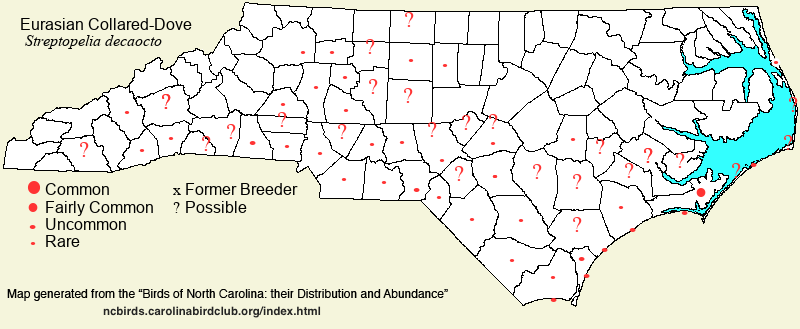 General Comments | The Eurasian Collared-Dove is the latest of the relatively few species (along with Rock Pigeon, European Starling, House Finch, and House Sparrow) that have been introduced into eastern North America that have spread into North Carolina and become established here as a breeding bird. This Eurasian species escaped from an aviary in the Bahamas in the 1970's and quickly spread to neighboring Florida (thus, not directly released in the United States). It has fairly rapidly spread northward and northwestward, and the first record for North Carolina came in 1994 on the Outer Banks at Salvo. By 2000, a few breeding populations were established in scattered south coastal towns, and there were widely scattered reports farther inland. However, even by 2025, the range is still mostly along the southern coast and nearby mainland, and in the southwestern part of the Piedmont and southern Coastal Plain near the South Carolina border. There are very few established nesting populations yet in the Piedmont or mountains, nor along the northern coast. Why it has yet to colonize urban and suburban areas in the northern Piedmont -- such as Raleigh, Durham, Greensboro, and Winston-Salem -- is hard to understand. The species occupies habitats utilized by both the Rock Pigeon and the Mourning Dove, in that it is found in towns and residential areas, mostly open with only scattered trees, preferably near the coast (so far). It is not normally found in agricultural areas (unlike the Mourning Dove), nor is it seen in areas away from man. It is commonly seen on telephone wires and other high perches, typically in yards or along streets. | ||||||