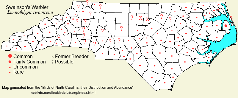 | General Comments | The Swainson's Warbler was once considered one of the rarest of warblers in the country. This perceived rarity was based as much on the extreme difficulty of actually seeing one without the use of a taped song as it is in terms of total numbers. It also has an unusual "bimodal" breeding range, nesting mostly in the Atlantic and Gulf Coastal Plains, but also to an extent in the southern Appalachians, with a hiatus in most of the Piedmont. In the Coastal Plain, it tends to require moderate to dense stands of cane beneath various canopy species, always in wetlands; these can be either riverine (swamps, bottomlands, and narrow streamside forested areas) or nonriverine (bay forests, taller pocosins, and even in some Loblolly Pine plantations). In the mountains and foothills, like the Worm-eating Warbler, it requires very dense and dark stands of Rosebay Rhododendron under various canopy species; Mountain Laurel or Carolina Rhododendron stands are occasionally used. These montane sites are usually near a stream, where the Swainson's loud song is often mistaken for the very similar song of the Louisiana Waterthrush. It is seldom detected in migration, as relatively few birds nest to the north of North Carolina, and as migrants are nearly silent. Despite some claims that the species is declining in overall numbers, such trends do not seem apparent in North Carolina; it seems as numerous now as it has ever been. In fact, singing males are appearing at more and more sites into the central Piedmont and across the mountains, where the presumed breeding range is expanding. | ||||||
