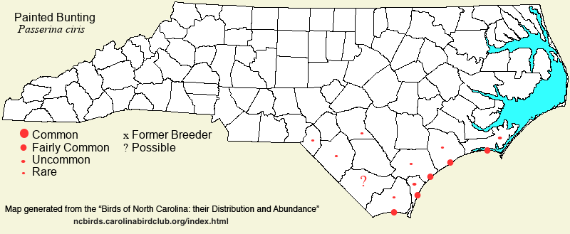 | General Comments | The adult male Painted Bunting is certainly the gaudiest-colored of North American songbirds. Thankfully, the species breeds as far north as coastal North Carolina, and it also ranges as far north as Missouri and Kansas. The subspecies that nests along and near the South Atlantic coast has been slowly declining, owing to long-term development of the maritime forests and thickets on the barrier islands and adjacent mainland. Fortunately, the buntings are somewhat adaptable, do not require but a few acres of habitat for a given pair of birds, and nest in wooded edges often close to man. Thus, birds are still fairly numerous along the southern coast. Oddly, a few birds are present in winter in coastal areas north to Buxton (Dare), typically at feeders. No other bird in the East likely has a "wintering" range that extends farther north than its breeding range. Also, despite a seeming decline in the breeding population, the number of birds being seen in the state in winter has been growing at a rapid rate, for unknown reasons. Breeding birds favor maritime thickets, edges of maritime forests, and other wooded edges, always close to salt or brackish water. Wintering birds occur mostly in dense evergreen thickets, such as in residential yards, maritime thickets, and other dense cover, at times mixing with sparrows. Unlike in South Carolina, where buntings nest well inland to the Fall Line, just below Columbia and other sites, the species in North Carolina had not been found nesting farther inland than about Orton Plantation in eastern Brunswick, until a rash of summer records of singing males and a juvenile were noted in Robeson in 2022-23. Thus, the species seems to be spreading inland close to the South Carolina border in recent years. There have also been isolated instances of singing males far inland, even to Raleigh (Wake), often for a few weeks, but there is no evidence of breeding yet. | ||||||