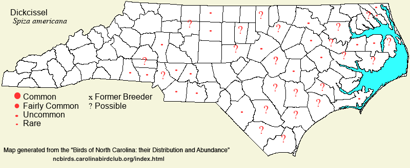 | General Comments | Although there are numerous birds that are highly erratic wintering species in North Carolina and elsewhere in the East, no other bird is so erratic as a breeder in the eastern half of the continent as is the Dickcissel. In addition, the Dickcissel has no close relatives, and thus it not only is in its own genus, its taxonomic placement is completely unsettled. The species is common to abundant as a breeder in the Great Plains, but it has always been rare and erratic as a breeder east of the Appalachians. Also, it has little site fidelity, and a colony can appear one summer in a field and not be present the next year, even where conditions look similar; in the state, breeding occurs essentially in the Piedmont and Coastal Plain. As a migrant, it is known mostly from the immediate coast in fall (often detected by its buzzy call overhead, even without one seeing the bird). The species also "winters" in the state in small numbers, usually near the coast, but not enough to say it is a "winter resident". Favored breeding habitat is quite particular -- weedy fields with a moderate amount of tall, sturdy composites (and at times a few seedling woody plants) -- used for singing perches; grassy or weedy fields without sturdy singing perches are typically not suitable (though fences and fence posts can substitute for composites and saplings for singing perches). At other seasons, they can appear in a variety of weedy or brushy sites, often mixing with flocks of sparrows; a few even turn up at feeders. | ||||||